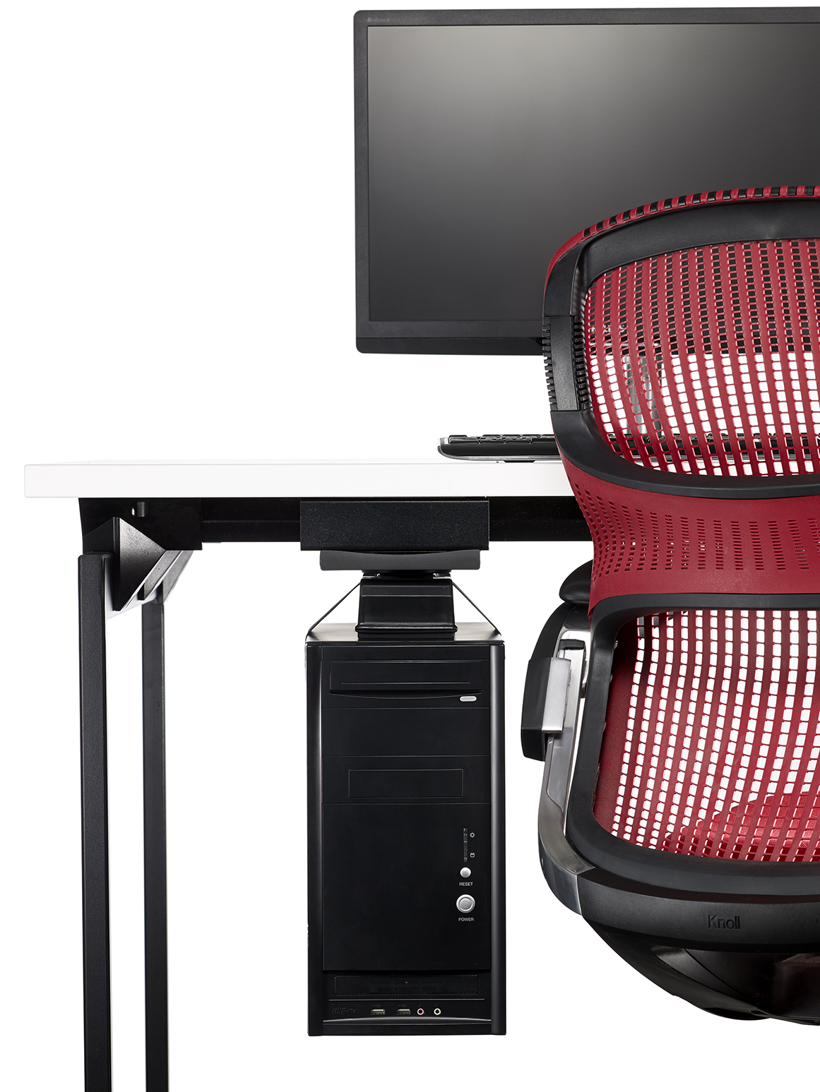 Knoll CPU Holders mount to the underside of most worksurfaces in order to maximize desktop and floor space. Designed to swivel 360 degrees, the bracket enables easy access to ports and cables without removing the CPU from the sliding track. The holder is available in either nylon or steel.