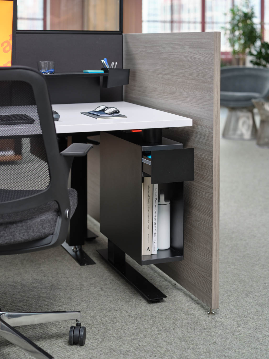 Antenna Suspended Hybrid Storage further supports planning in compact workstations with a series of suspended storage cases available in open, open with bin, and drawer configurations. Suspended storage pairs with Tone, k. stand,and  k. bench height adjustable tables, as well as fixed-height worksurfaces.