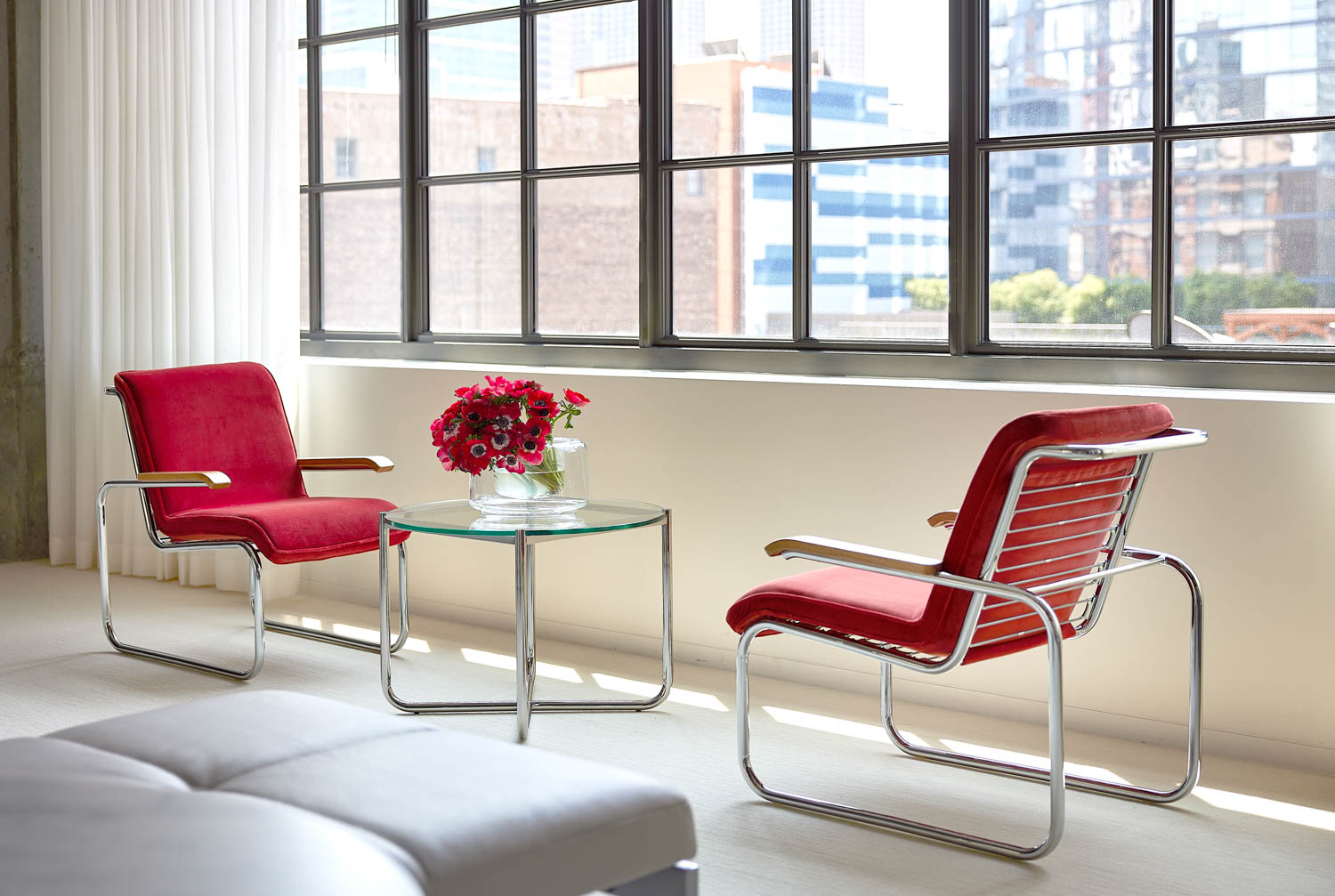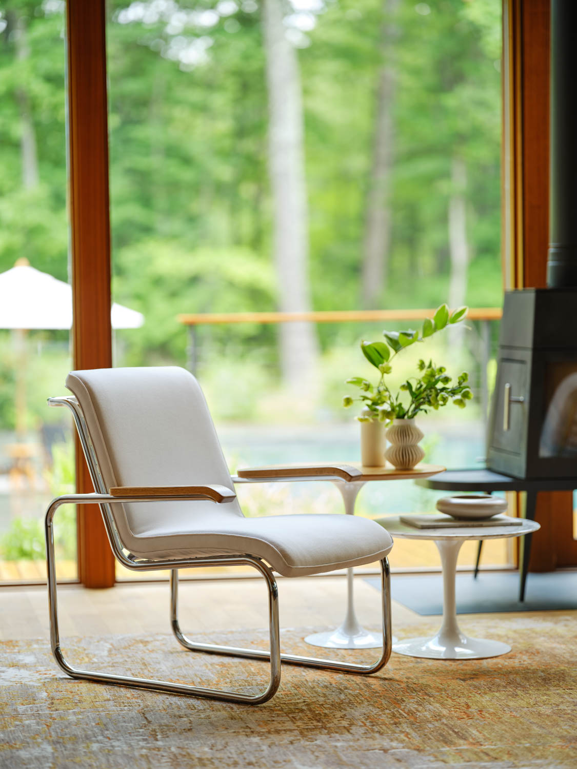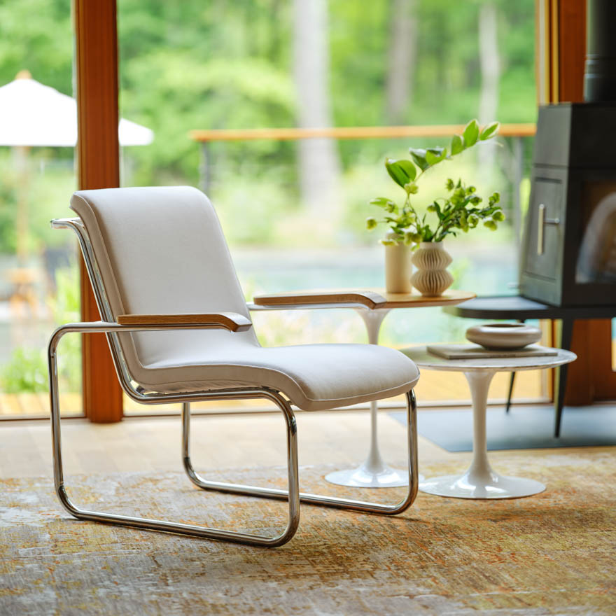Marcel Breuer 1929 MB Lounge is part of the architect’s extensive work using tubular steel, a revolutionary material in furniture construction at the time. In a contrast to the Wassily Chair—one of Breuer’s best-known designs from the Bauhaus—the MB Lounge features a seemingly continuous, freefloating frame, simultaneously reflecting a tensile strength and straightforward elegance. The chair combines an upholstered foam cushion supported by horizontal metal springs that provide slight movement to the back, along with natural oak armrests that have a clear lacquer finish.