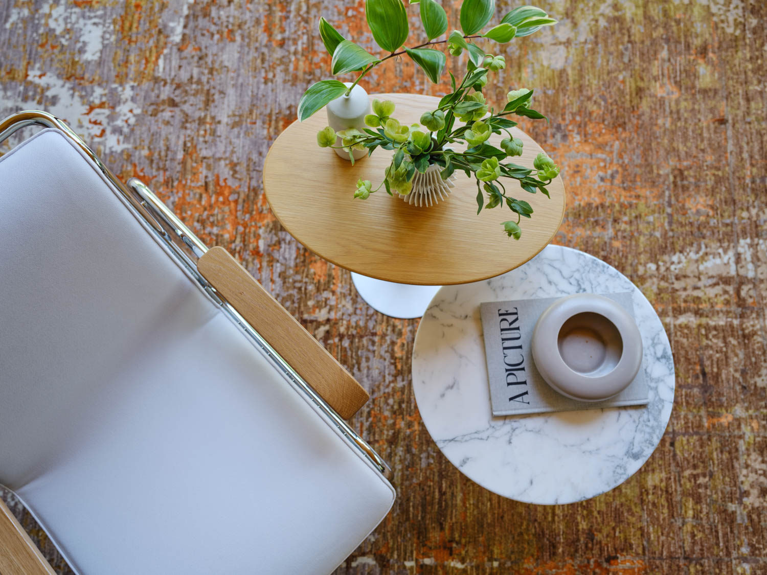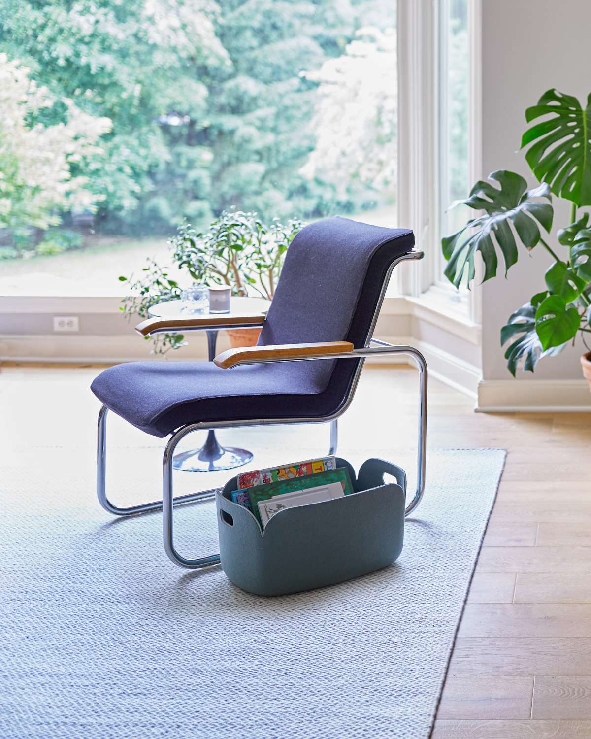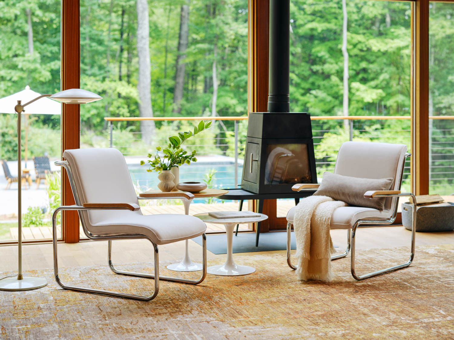 Marcel Breuer 1929 MB Lounge is part of the architect’s extensive work using tubular steel, a revolutionary material in furniture construction at the time. In a contrast to the Wassily Chair—one of Breuer’s best-known designs from the Bauhaus—the MB Lounge features a seemingly continuous, freefloating frame, simultaneously reflecting a tensile strength and straightforward elegance. The chair combines an upholstered foam cushion supported by horizontal metal springs that provide slight movement to the back, along with natural oak armrests that have a clear lacquer finish.