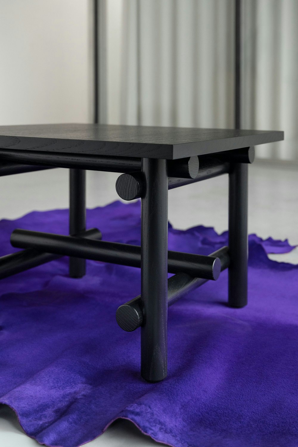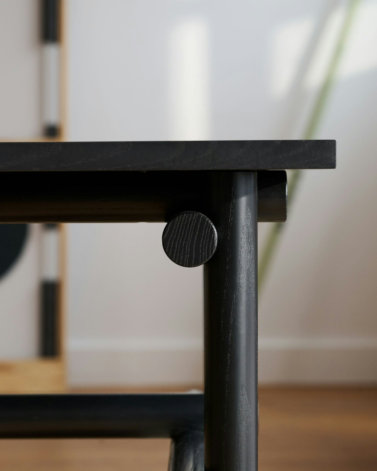 Muecke developed a distinct joinery system that repeats throughout the collection. Rounded dowels pass on adjacent planes, connected where they meet by a floating tenon.