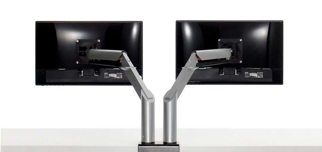 Dual Sapper XYZ offers fluid, independent movement for two monitors mounted to a shared clamp. The inventive design features one-touch adjustability especially critical to the high performance workplace.