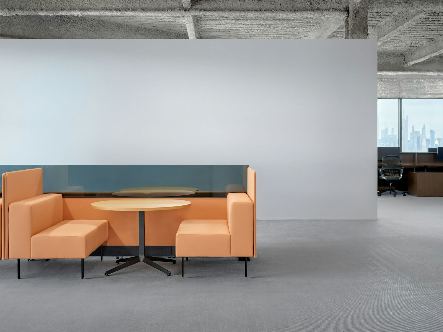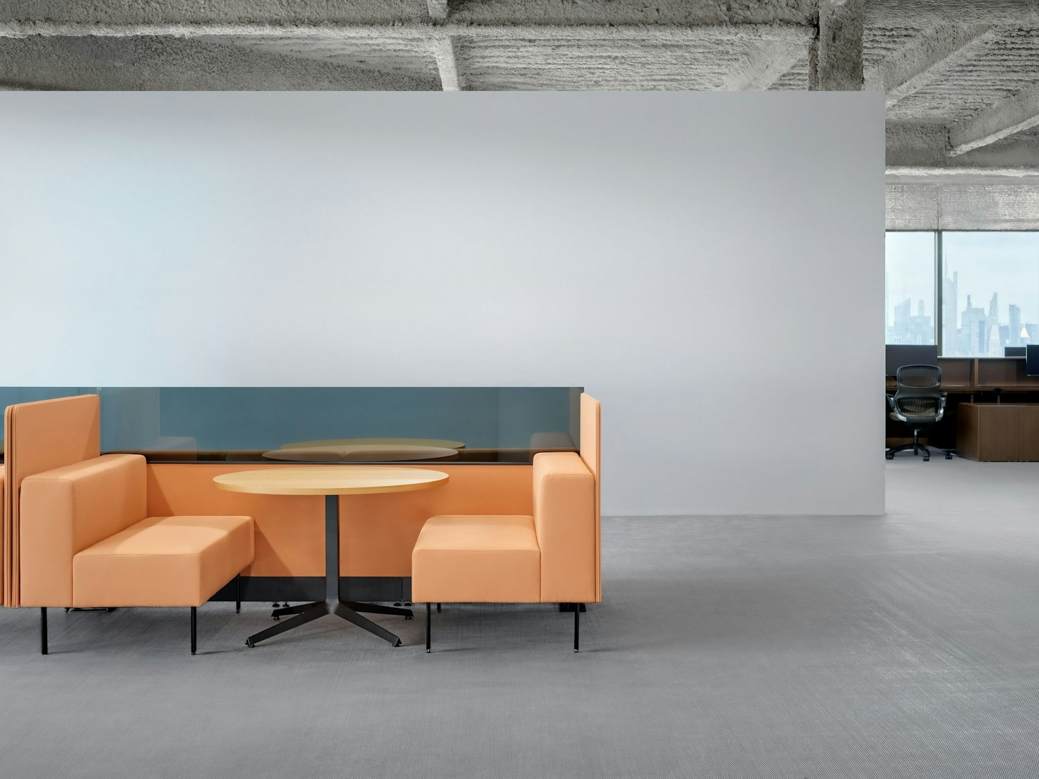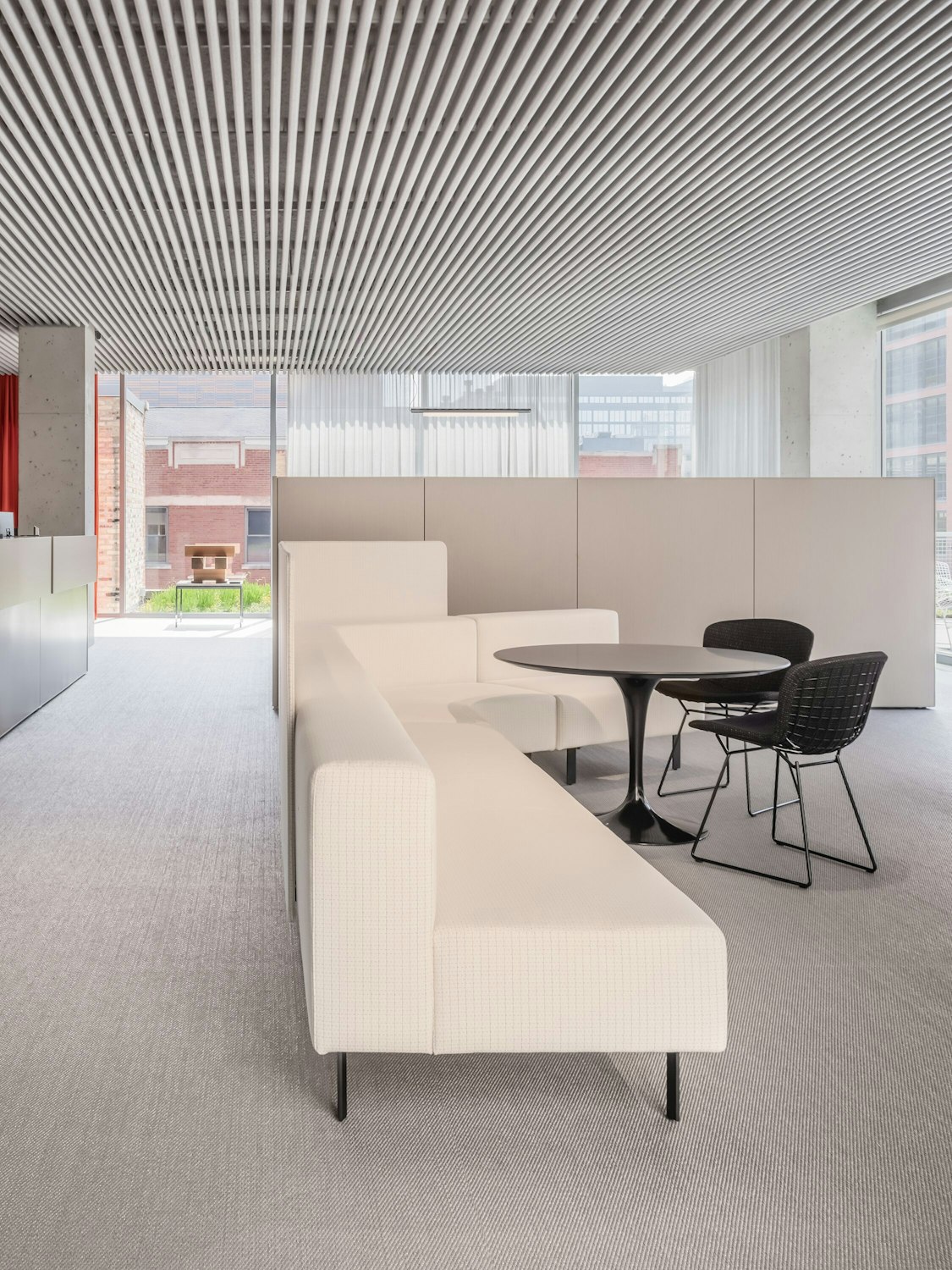 19501 | Dividends Skyline System with Screens, Height-Adjustable Table, Skyline Lounge, Saarinen Side Table, and Generation by Knoll Chair