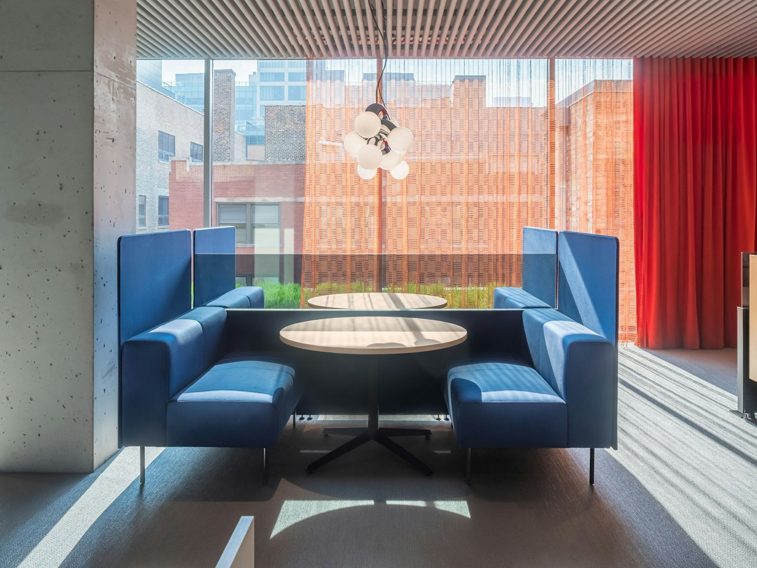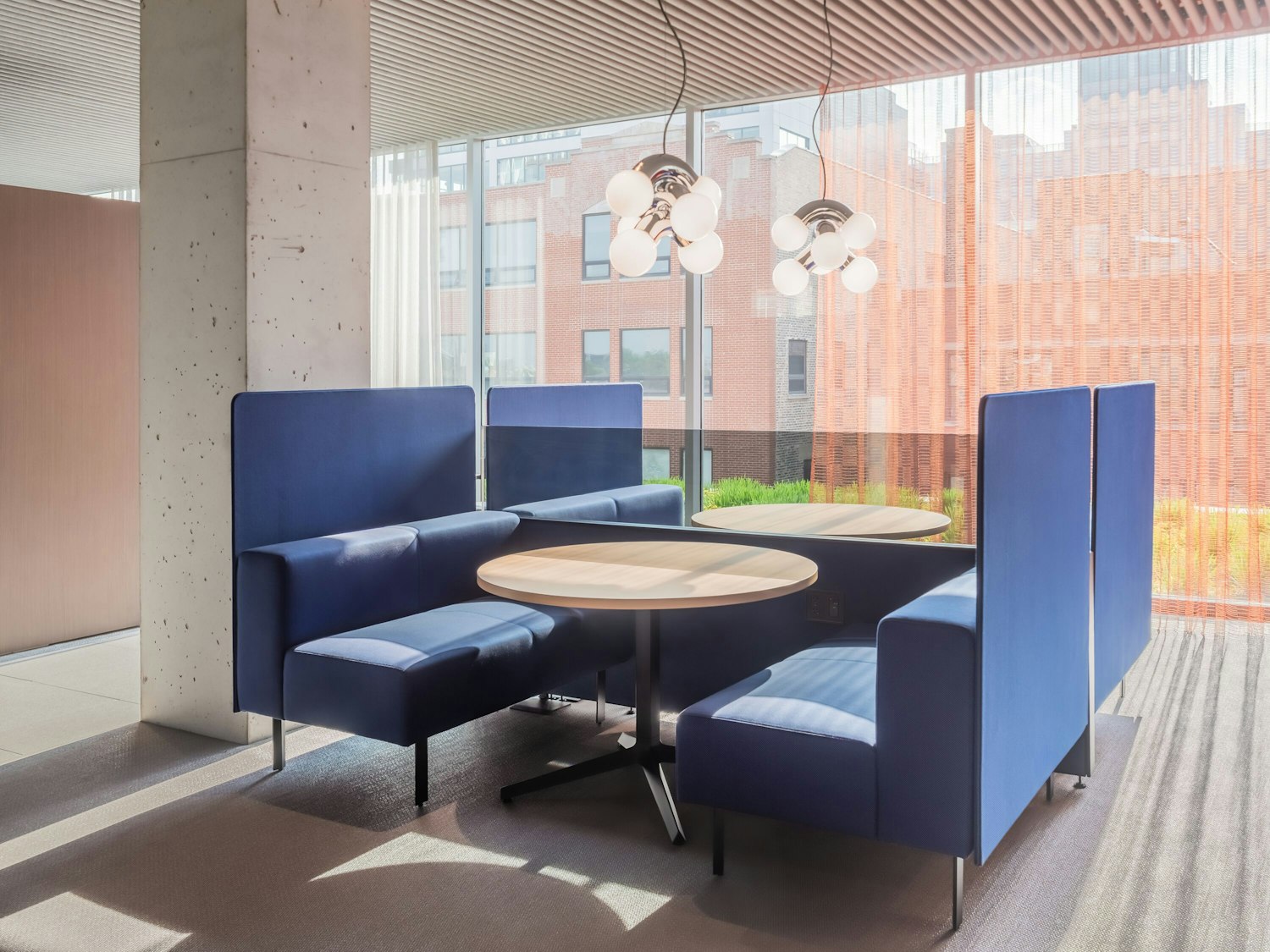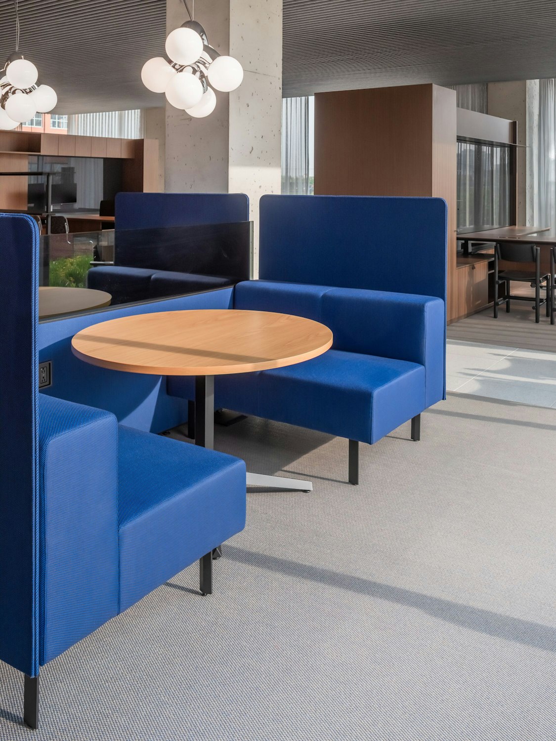 19501 | Dividends Skyline System with Screens, Height-Adjustable Table, Skyline Lounge, Saarinen Side Table, and Generation by Knoll Chair
