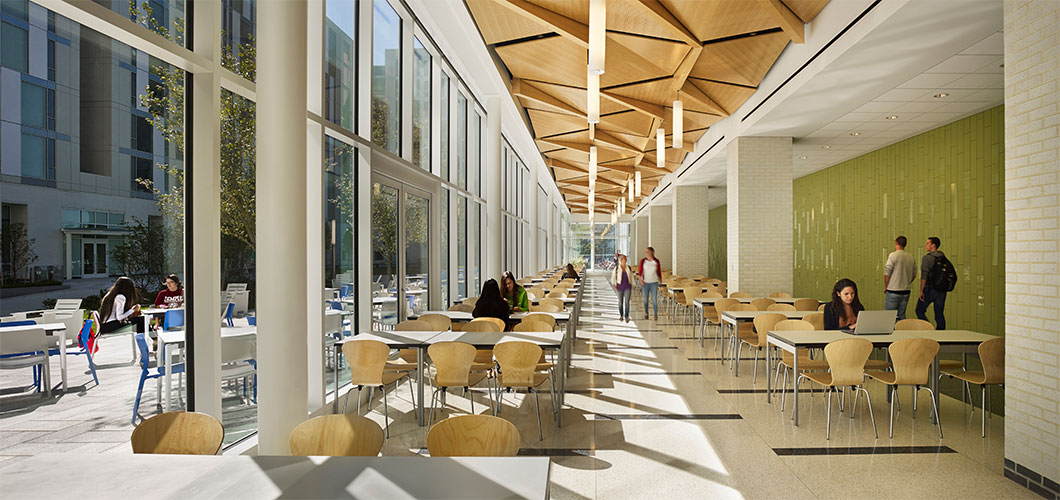 The Mitchell and Hilarie Morgan Residence Hall and Dining Complex at Temple University opened in the Fall of 2013. The 33-story-structure includes two residence buildings, a dining hall and a 30,000 square-foot terrace. Morgan Hall is designed to inspire learning and collaboration and to connect students to the surrounding Philadelphia area.