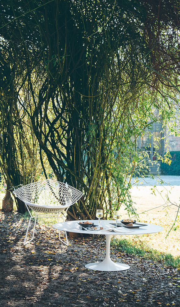 17747 | Bertoia Outdoor Diamond Chair with Saarinen Outdoor Coffee and Side Tables