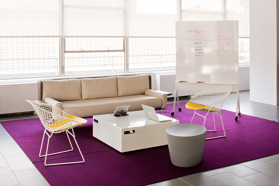 19252 | MillerKnoll San Francisco Showroom with D'Urso Swivel Chairs, Pfister Sofa, Bertoia Diamond Chair, Saarinen Lounge Height Table, and Tulip Stools
