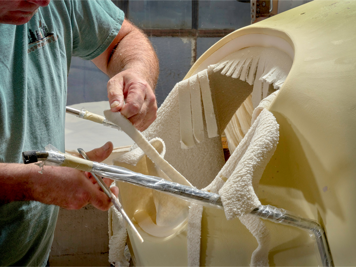 He and Florence heard of a New Jersey-based commercial shipbuilder who was experimenting with fiberglass and resin. After many iterations and prototypes, the fiberglass form was perfected. Coupled with ample armrests and a sweeping backrest, the comforting cup-like effect that Florence craved took shape.